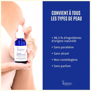 Le Sérum à l’Acide Hyaluronique de Taïmo Cosmétique hydrate intensément la peau et lui redonne un aspect plus lisse et plus jeune. Grâce à deux types d’acide hyaluronique, il agit à la surface et en profondeur pour repulper la peau. Enrichi en gluconate de cuivre, il booste le collagène et apaise les rougeurs. Un indispensable pour une peau douce, éclatante et visiblement revitalisée.