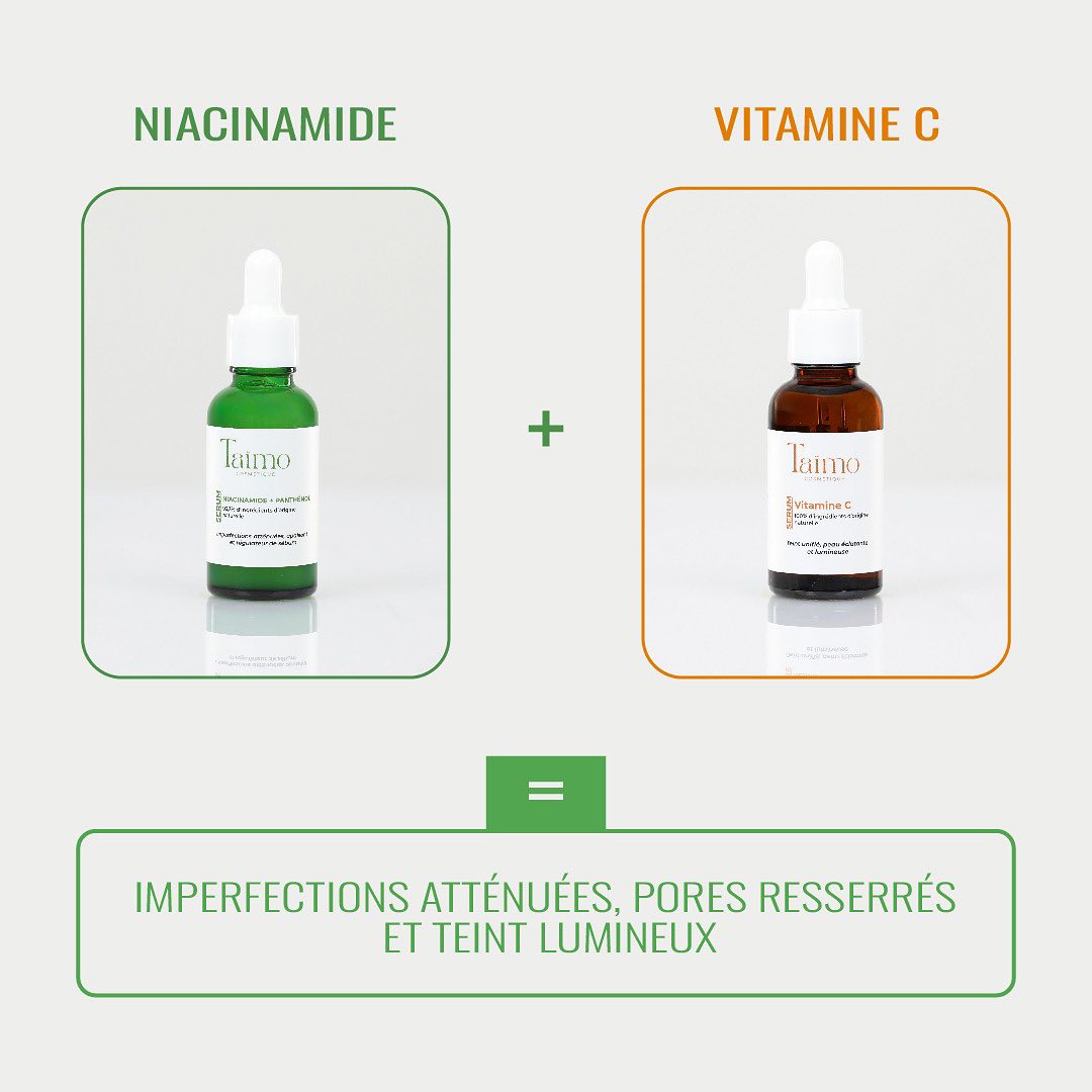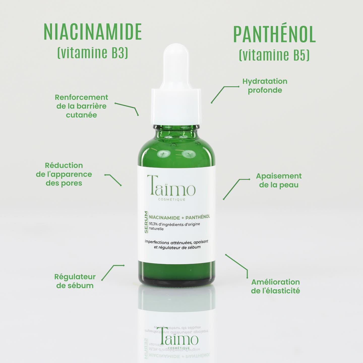 Le Sérum Niacinamide + Panthénol de Taïmo Cosmétique est un soin multifonctions composé de 93,3% d’ingrédients d’origine naturelle, qui aide à réguler la production de sébum, apaiser la peau et améliorer son élasticité. Enrichi en Niacinamide (Vitamine B3) et Panthénol (Vitamine B5), ce sérum est spécialement conçu pour les peaux sujettes aux imperfections et aux déséquilibres cutanés.