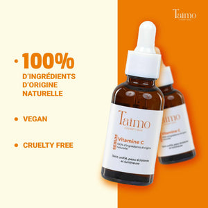 Le Sérum Vitamine C de Taïmo Cosmétique illumine le teint, réduit les taches et booste l’éclat naturel de la peau. Grâce à sa vitamine C pure, il unifie, protège des radicaux libres et stimule le collagène pour une peau plus lisse, plus lumineuse et visiblement rajeunie. Une formule 100% naturelle pour retrouver un teint éclatant jour après jour.